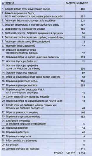 Διαπιστώθηκαν 3.024 παραβάσεις του Δασικού Κώδικα, για τις οποίες τηρήθηκαν όλες οι νόμιμες διαδικασίες (μηνύσεις - κατασχέσεις παράνομων μέσων κ.τ.λ.) που προβλέπονται από το Νόμο. Οι μηνύσεις που πραγματοποιήθηκαν βάση. των παρανόμων πράξεων δίδονται στον πίνακα δίπλα.