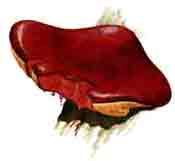 Συνήθως βρίσκεται πάνω στη βελανιδιά. Το πάνω μέρος του είναι κοκκινωπό και το κάτω ροζ, με βράγχια που μοιάζουν με μεγάλη γλώσσα. Η κόκκινη σάρκα του εκκρίνει ένα κόκκινο υγρό. Είναι σκληρό και πικρό. Οι νεαροί βλαστοί είναι πιο εύγευστοι. Αφήστε τους στο νερό να μουσκέψουν και να μαλακώσουν και μετά μαγειρευτέ τους. Φυτρώνουν το φθινόπωρο.