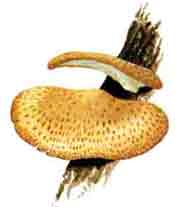 . Έχει κεφαλή καστανόξανθη με καφέ στίγματα. Αναπτύσσεται κατά πλάτος με διάμετρο 3-15 εκ. Έχει άσπρα βράγχια που έχουν πιτσιλίσματα καφέ, λευκό κρέας και ρίζες που μοιάζουν με κορδόνια. Φυτρώνει πάνω σε δέντρα που ζουν πολλά χρόνια σε κωνοφόρα δέντρα και θάμνους. Η περίοδος ανάπτυξης του είναι απ' την άνοιξη ως το φθινόπωρο. Κόψτε το και σιγοβράστε το.