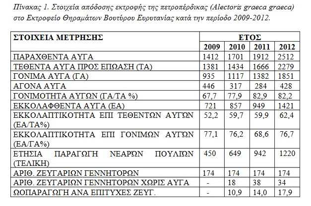 Πίνακας 1. Στοιχεία απόδοσης εκτροφής της πετροπέρδικας (Alectoris graeca graeca)
