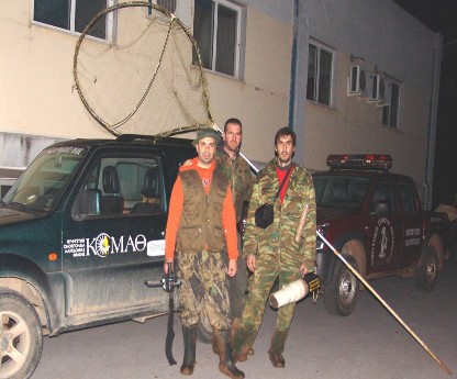 Σχήμα 1. Συνεργείο σύλληψης περδίκων, από τα αριστερά: θερμοκάμερα για τον εντοπισμό των πτηνών τη νύχτα, ειδικά κατασκευασμένη απόχη και κατάλληλα διαμορφωμένος προβολέας.Figure 1. Team of trappers, from the left: thermal camera to identify birds at night, specially designed hand-held net and spotlight.