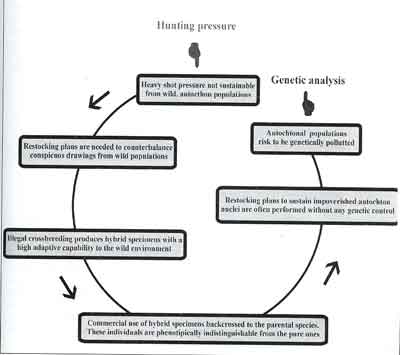 Όλα τα είδη του γένους Αlectoris (Αves, Galliformes) που διαβιώνουν στη Μεσόγειο έχουν μεγάλη θηρευτική αξία. Τα είδη αυτά συμπεριλαμβάνονται στον Ευρωπαϊκό Κατάλογο Διατήρησης (Species of European Conservation Concern SPEC). Ο φυσικός υβριδισμός στο γένος Αlectoris αποτελεί ένα σχετικά περιορισμένο φαινόμενο όταν συγκρίνεται με τον διαδεδομένο και παράνομο υβριδισμό των περδίκων στα εκτροφεία. Τα εκτρεφόμενα αυτά υβρίδια χρησιμοποιούνται συχνά στις απελευθερώσεις συνιστώντας σοβαρή απειλή για τη φυσική γενετική ποικιλότητα. Το Τμήμα Ηθολογίας, Οικολογίας και Εξελικτικής του Πανεπιστημίου της Πίζας ξεκίνησε τη διερεύνηση της επίδρασης των απελευθερώσεων στη γενετική δομή των πληθυσμών των περδίκων του μεσογειακού χώρου από το 2001. Οι πληθυσμοί Αlectoris ερευνώνται αυτήν την περίοδο στην Ισπανία, Κορσική (Γαλλία), την Ιταλία, την Ελλάδα και την Κύπρο. Εφαρμόζονται μοριακές τεχνικές όπως οι δείκτες μιτοχονδριακής αλληλουχίας DΝΑ και η RAPD (Random Amplified Polymorphic DΝΑ). Η τελευταία αποτελεί μια μέθοδο αξιόπιστη, γρήγορη και μικρού σχετικά κόστους, η οποία αναμφίβολα επιτρέπει τον εντοπισμό των μη καθαρών πουλιών.