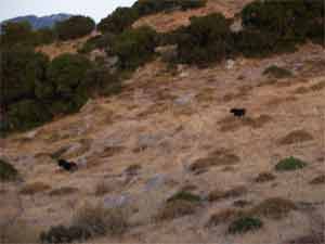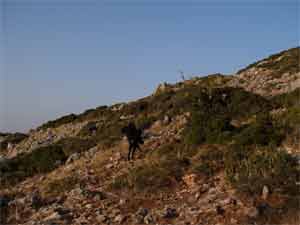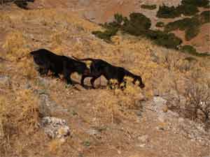 Κατεβαίνω λοιπόν και φτάνω στο υποτιθέμενο σημείο περίπου μετά από 30 λεπτά , όλη η πλαγιά είναι καταλυμένη από τα γίδια , με πλησιάζει ο βοσκός και με παρακαλεί να μαζέψω τα σκυλιά γιατί τα πράματα του αναστατώνονται και δεν θέλει να τρέχει να τα μαζέψει , όπως και γίνεται.