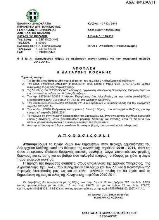 Απαγόρευση κυνηγίου στο Νομό Καζάνης λόγω παγετού και χιονιού !